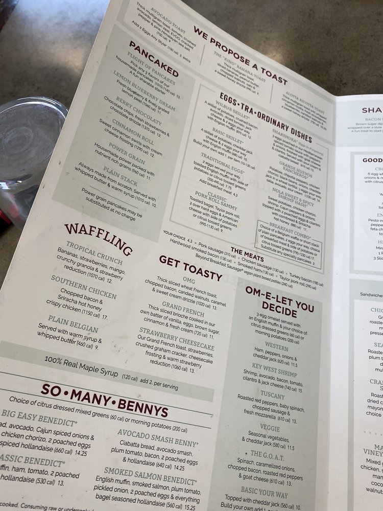Choice of a Belgian waffle or plain pancakes, eggs your way, choice of breakfast meat & side of potatoes or citrus dressed greens